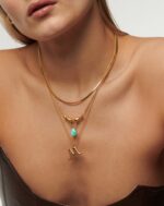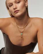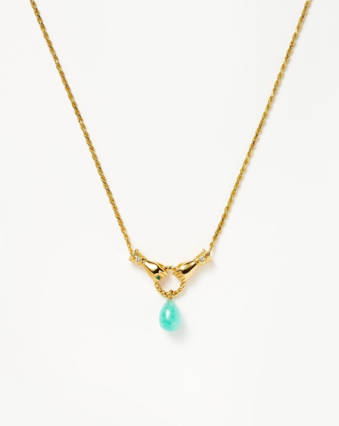 A Harris Reed x Missoma Icon reimagined. Two Georgian-inspired hands come together in the 18ct gold vermeil pendant. each holding a twisted ring with a single oval drop amazonite gemstone. Intricately detailed. each cuff has been illuminated with white pearl cabochons and features a ring with a malachite semi-precious stone. The 18ct gold plated chunky rope chain is finished with the collection’s bespoke butterfly end charm. a symbol of duality.
