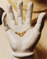 Two Georgian-inspired hands come together in this pendant. each holding a twisted ring. Intricately detailed. each cuff has been illuminated with white pearl cabochons and features a ring with a black onyx gemstone. The seed pearl necklace is finished with the collection’s bespoke butterfly end charm. a symbol of duality. Pair with the . Layer for less when bought as a set .