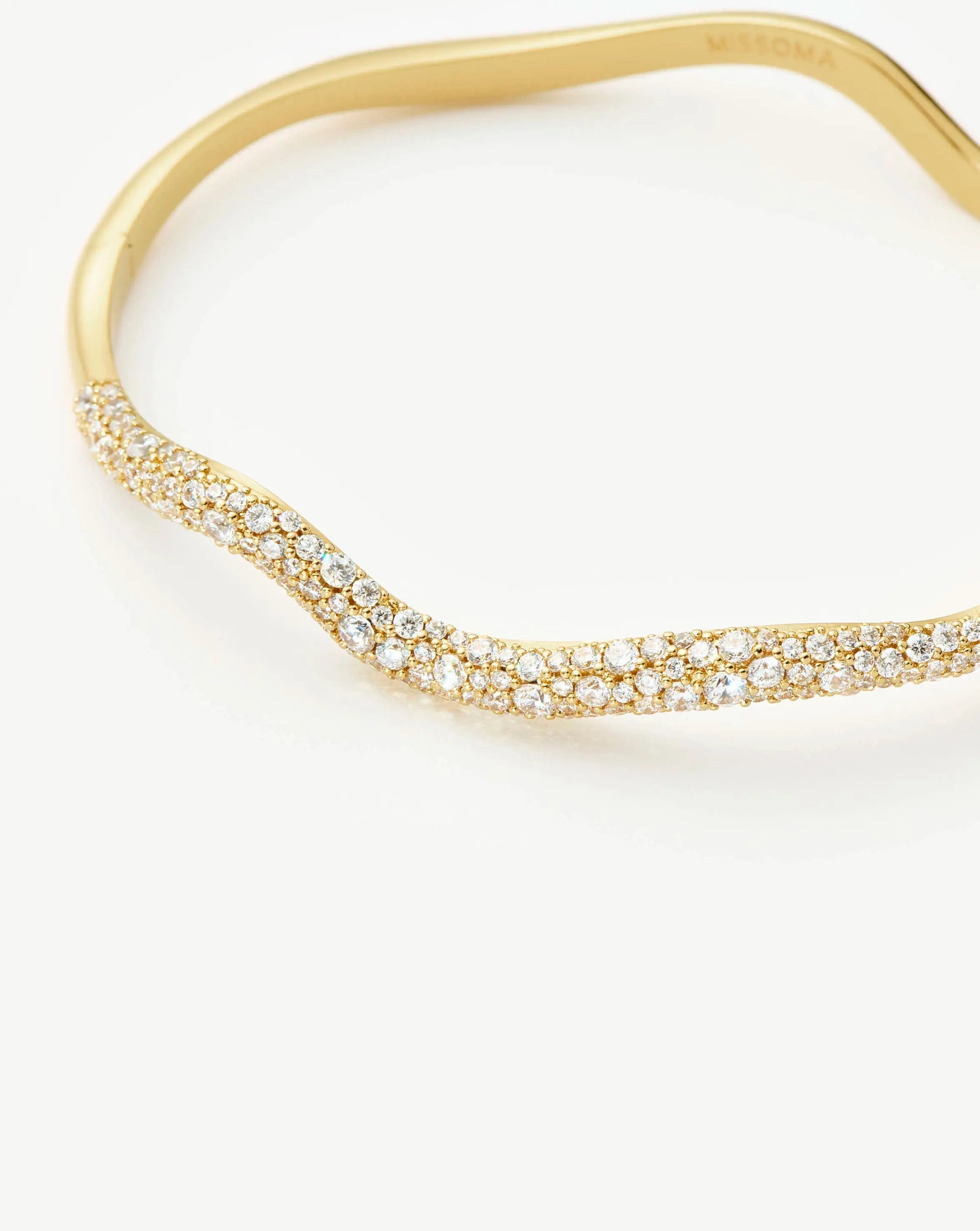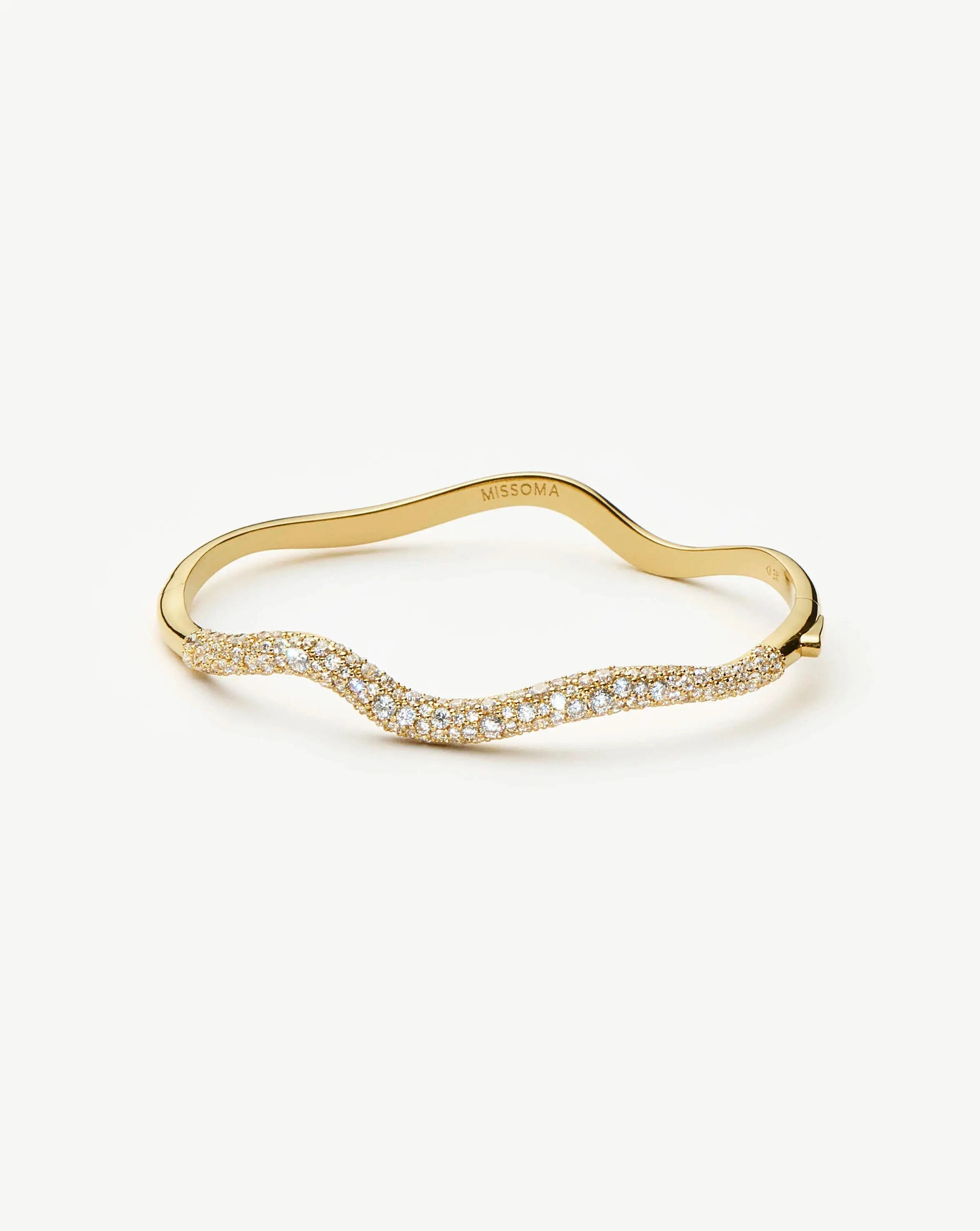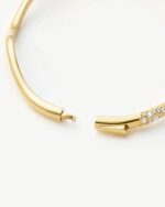An evolution of our best selling Molten and Magma collections with soft organic curves. The molten gold texture gives the hinged bangle a sculptural look with a frosting of snow pavé to mimic ice crystals. Artfully hand-set. this highly-skilled technique is usually only seen in the most delicate of fine jewellery pieces. Designed with a hinged closure for easy wear. its refined curves and subtle shimmer make it the perfect piece to elevate your everyday bracelet stack.