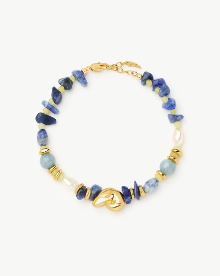This coastal-inspired bracelet features a blend of multi-beaded gemstones and baroque pearls with a central gold shell bead. The perfect accessory for any summer occasion.